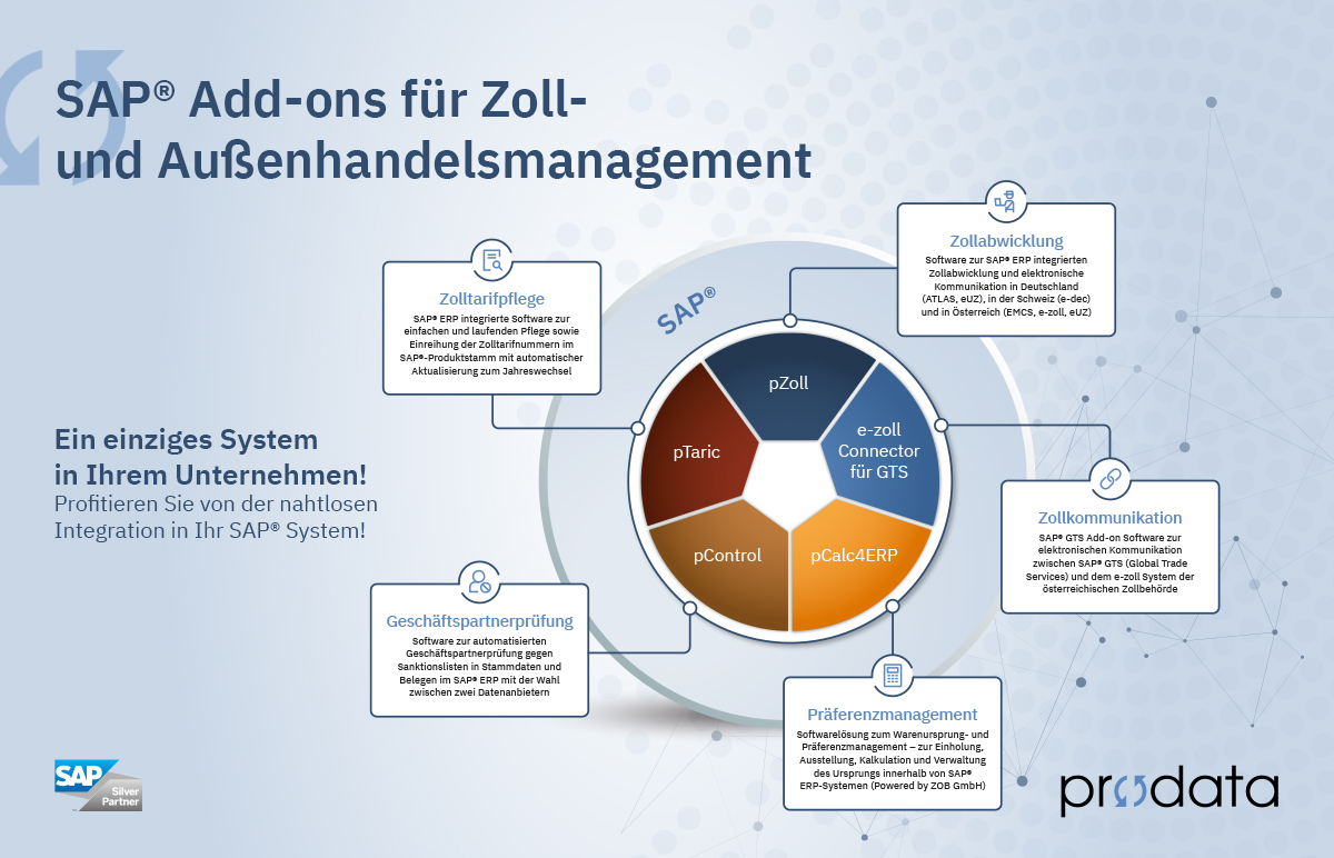 Demnächst schließen wir unser derzeit größtes Projekt ab: Die Importabwicklung mit ATLAS in Deutschland. Künftig bewerkstelligt unsere bewährte und umfassende Zollsoftware pZoll auch diese Aufgabe mit der gewohnt einfachen Handhabung direkt im SAP® ERP. Die elektronische Kommunikation von pZoll mit dem ATLAS System der deutschen Zollbehörde findet via FTAM statt. Außerdem wird es möglich sein mit dem Modul „NCTS Versendung“ ein elektronisches Versandverfahren zu eröffnen und mit dem Modul „NTCS Bestimmung“ elektronische Versandverfahren in Deutschland zu beenden.