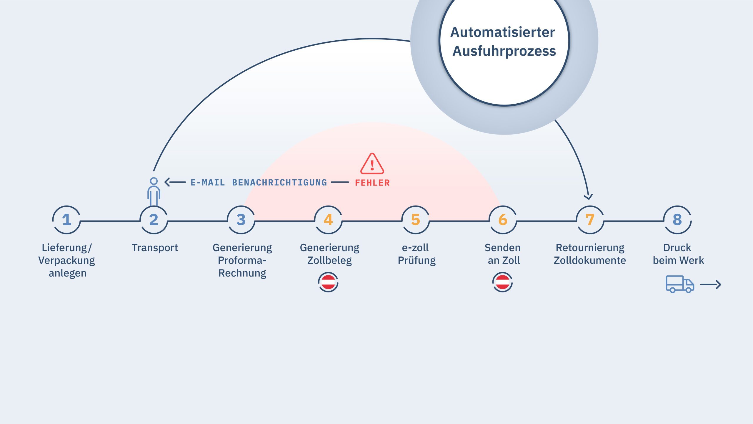 Nur im Fall einer Fehlermeldung stoppt der Ablauf rechtzeitig vor dem Senden des Zollbelegs an die Behörde. Der Zollverantwortliche erhält daraufhin eine E-Mail mit der Fehlermeldung und einer Aufforderung die Daten zu überprüfen. Nach Korrektur des Fehlers kann der automatische Prozess fortgesetzt werden. Im letzten Schritt erhält man die zollamtlich bestätigten Zolldokumente retour, welche sogar ohne Umwege beim gewünschten Werk gedruckt werden können.